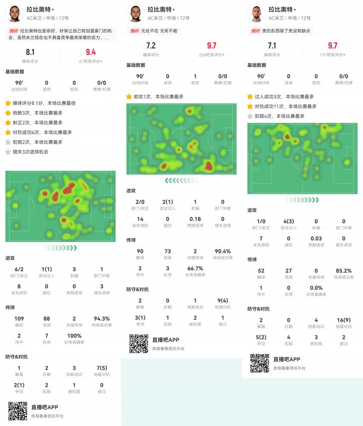 近3场比赛,拉比奥特均首发打满全场并送出1次助攻,AC米兰取得三连胜的战绩。