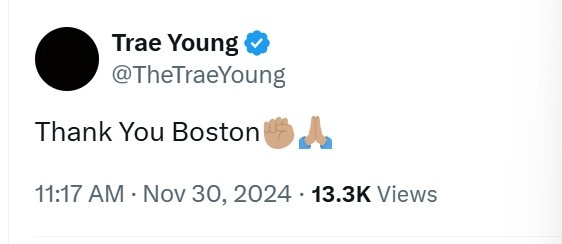 老鹰球星特雷-杨更推道:“感谢波士顿✊。”