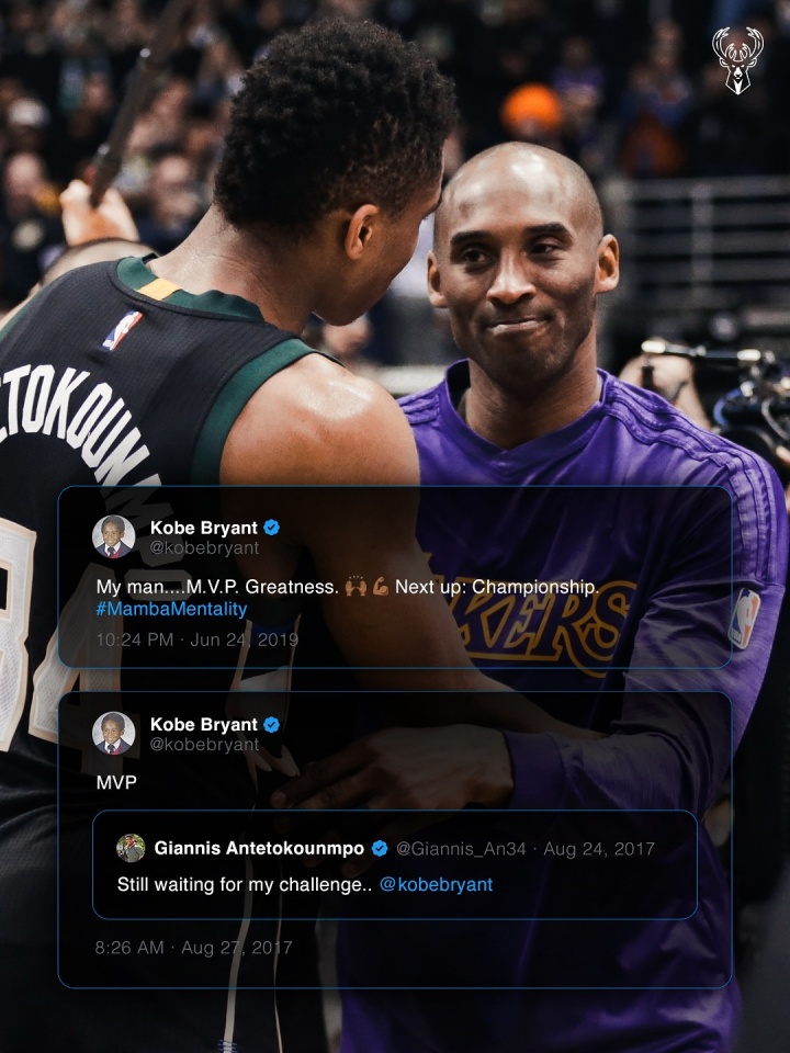 字母哥最终在2019年拿到了自己的第一个MVP,科比也发推祝贺:“我的兄弟……MVP!非常伟大!下一个挑战,总冠军!”