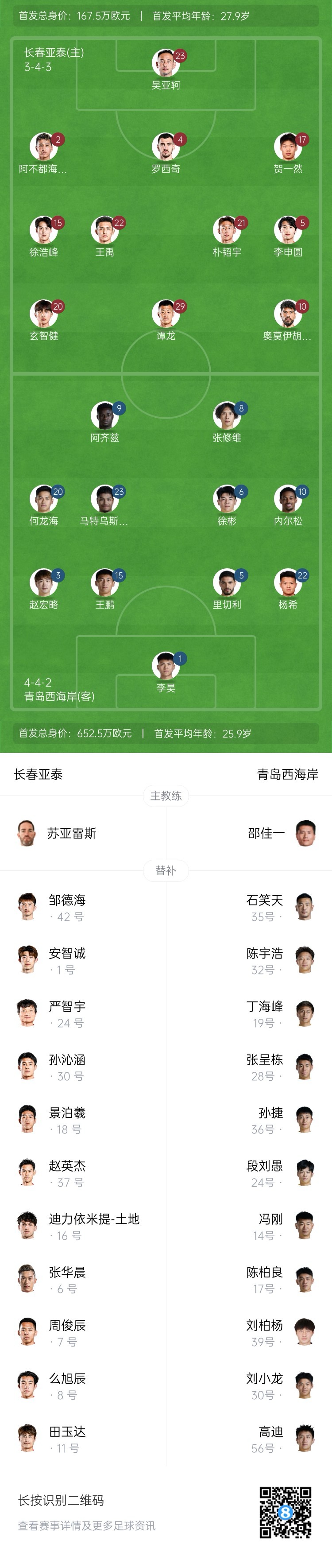 长春亚泰替补:1-安志诚、42-邹德海、6-张华晨、7-周俊辰、8-么旭辰、11-田玉达、16-迪力依米提-土地、18-景泊羲、24-严智宇、30-孙沁涵、37-赵英杰
