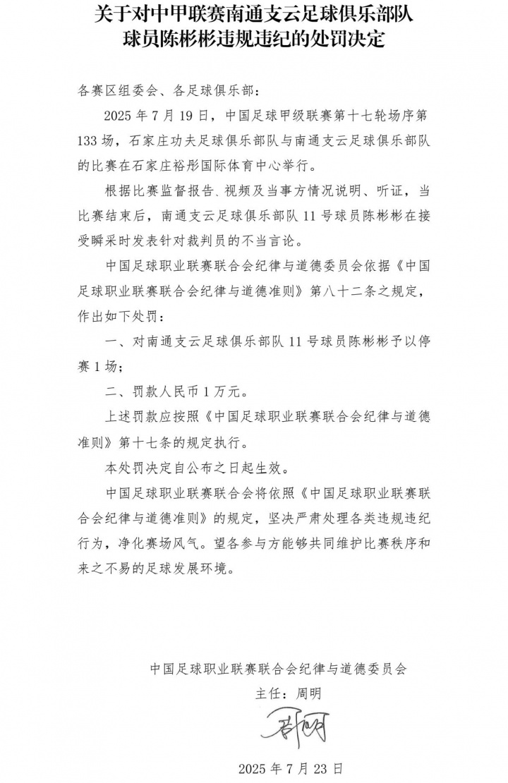 一、对南通支云足球俱乐部队11号球员陈彬彬予以停赛1场;