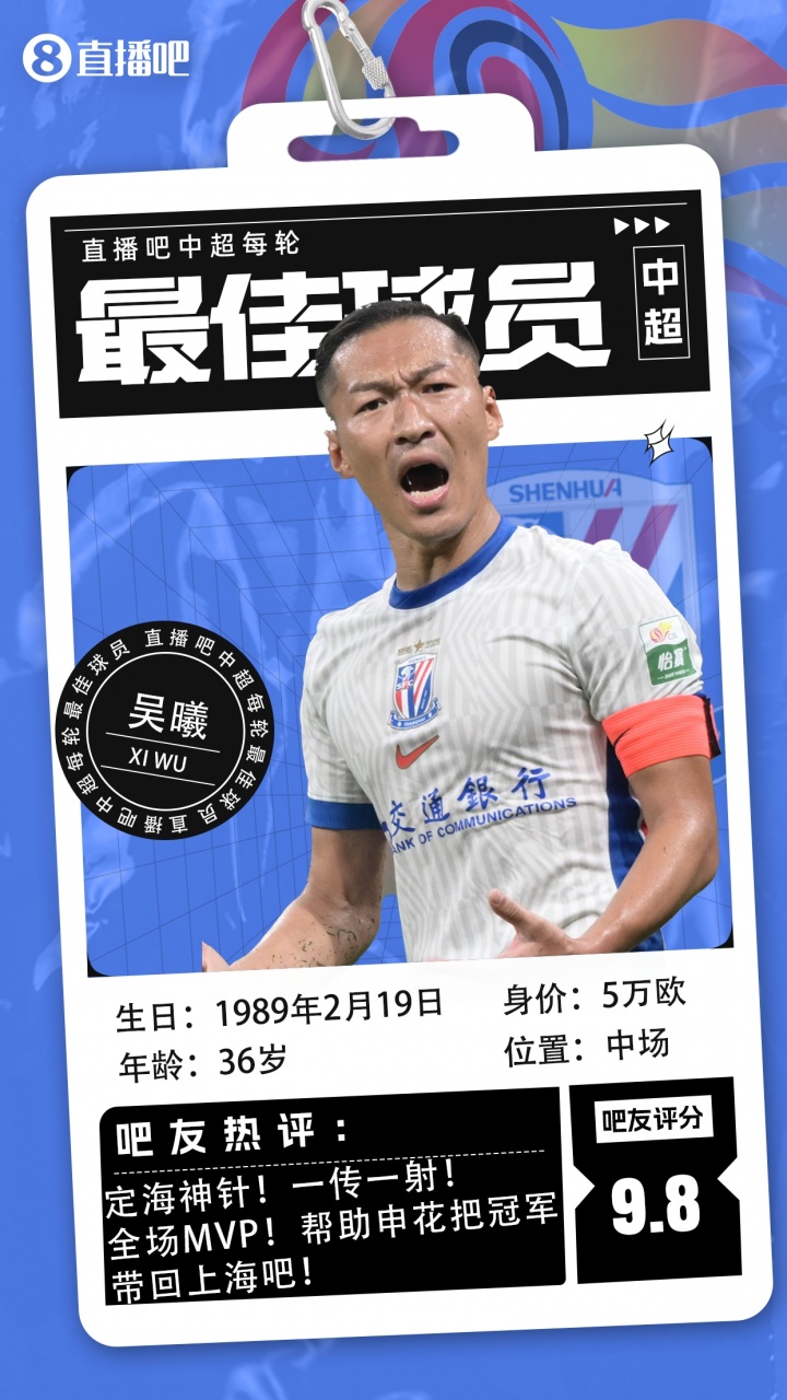 【】中超第17轮最佳球员评选出炉,36岁申花老将吴曦贡献一传一射,当选本轮最佳球员。