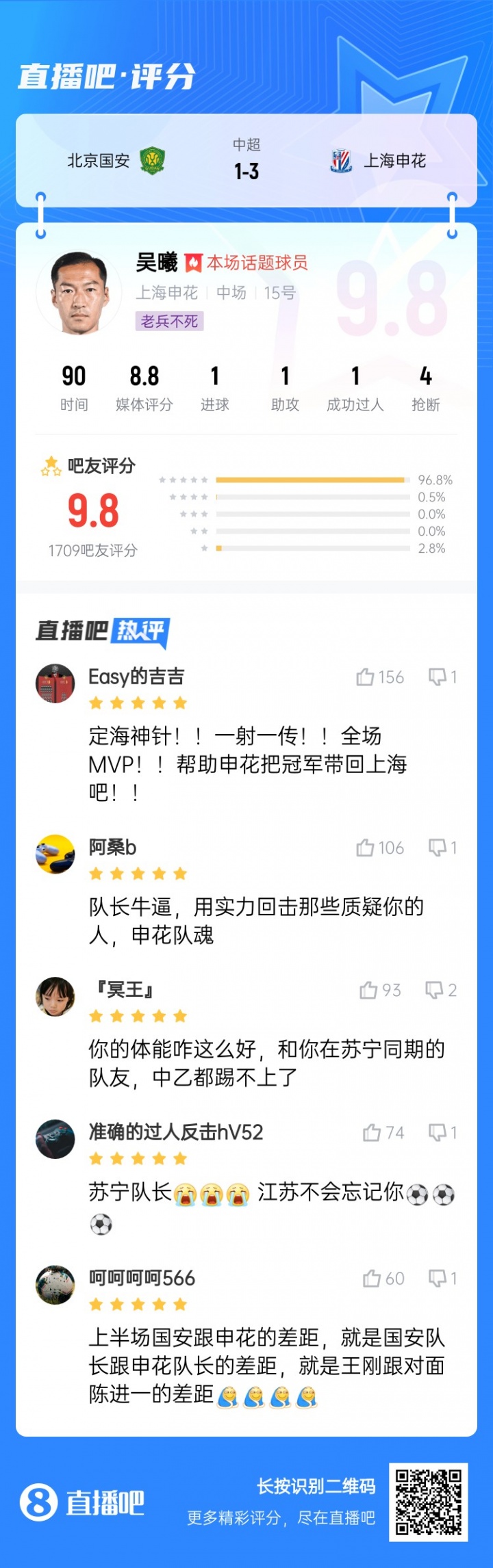 吴曦在申花客战国安的榜首之战中,首发打满全场。这位中场的老将传射建功,帮助申花取胜&3分领跑中超。