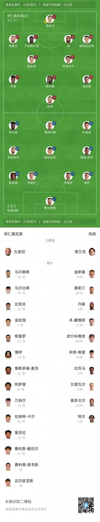 拜仁替补:26-乌尔赖希、40-乌尔比希、3-金玟哉、20-比绍夫、22-格雷罗、23-博伊、24-万纳尔、30-基亚拉、36-维斯多姆-麦克、38-查伟斯、41-阿萨雷、46-伦纳特-卡尔、47-桑托斯-戴伯尔、49-马格努斯-达尔皮亚斯