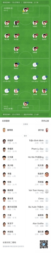 国安近期状态不佳,联赛遭遇两连败,目前在中超积48分暂列第4,落后榜首5分;河内公安近期豪取3连胜,位列越南联榜首。