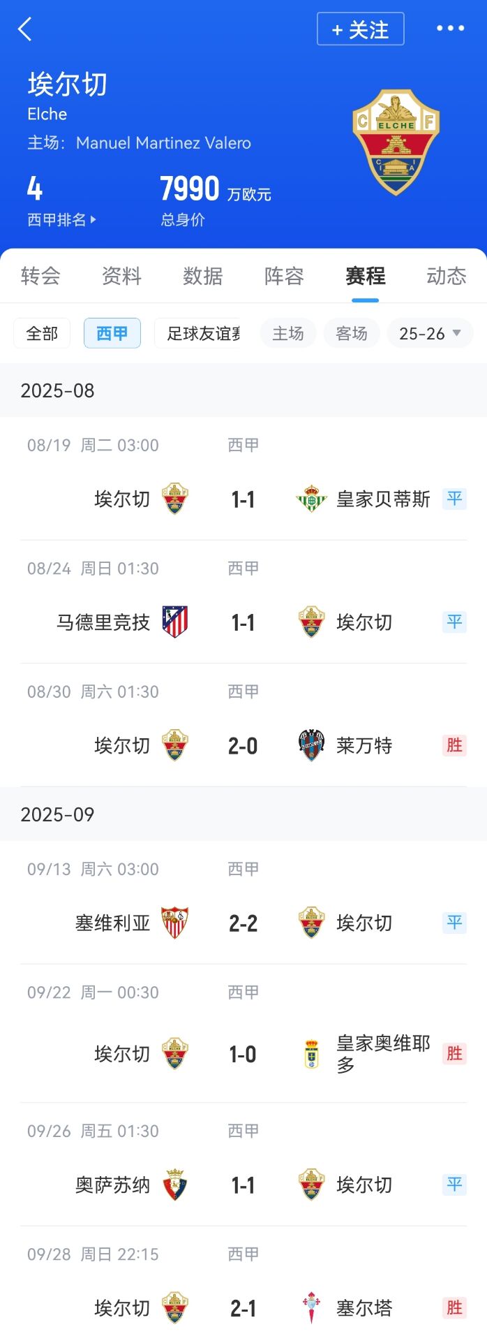 升班黑马?埃尔切西甲7轮不败联赛排名第4 全队身价不足8000万欧
